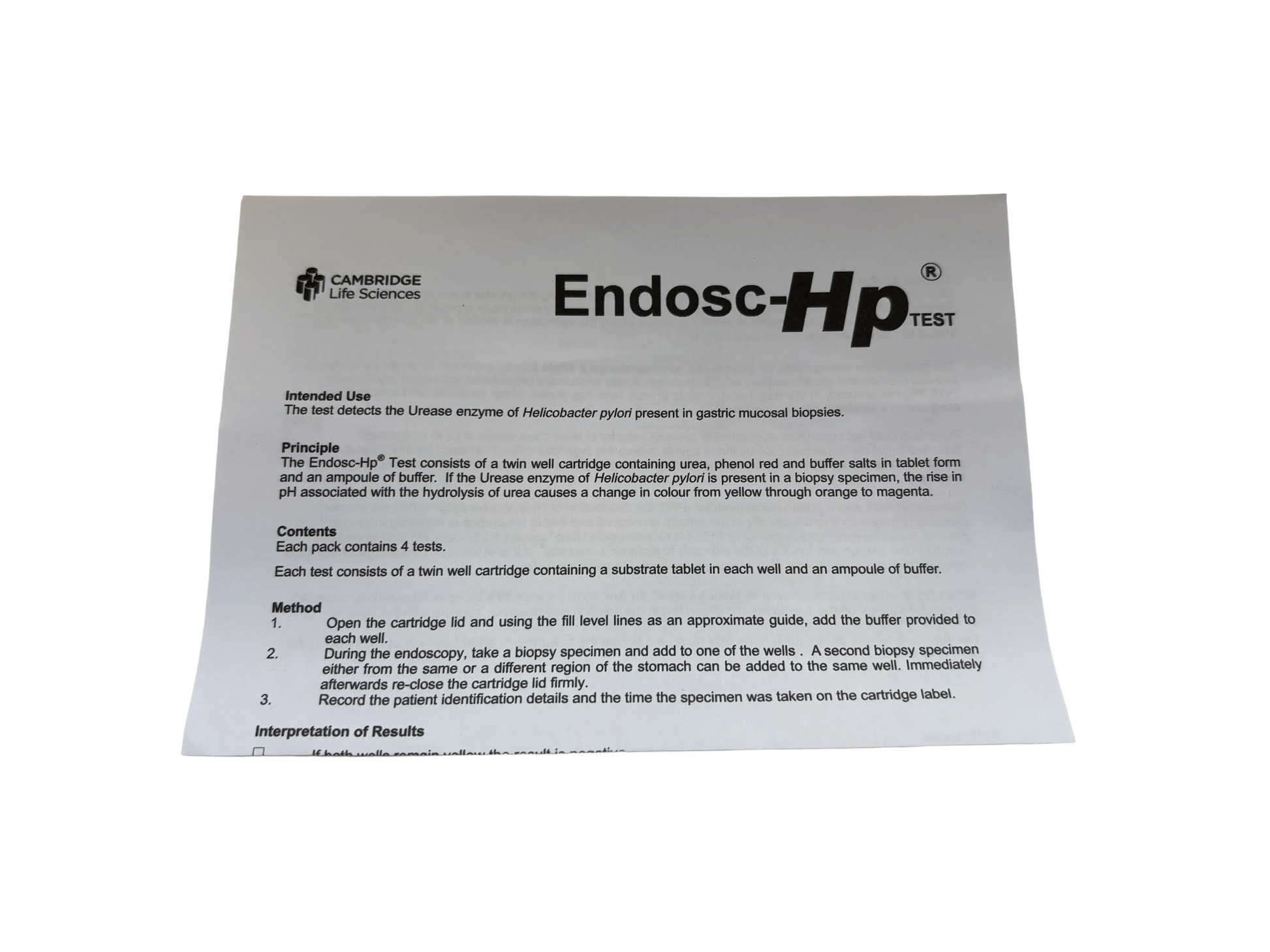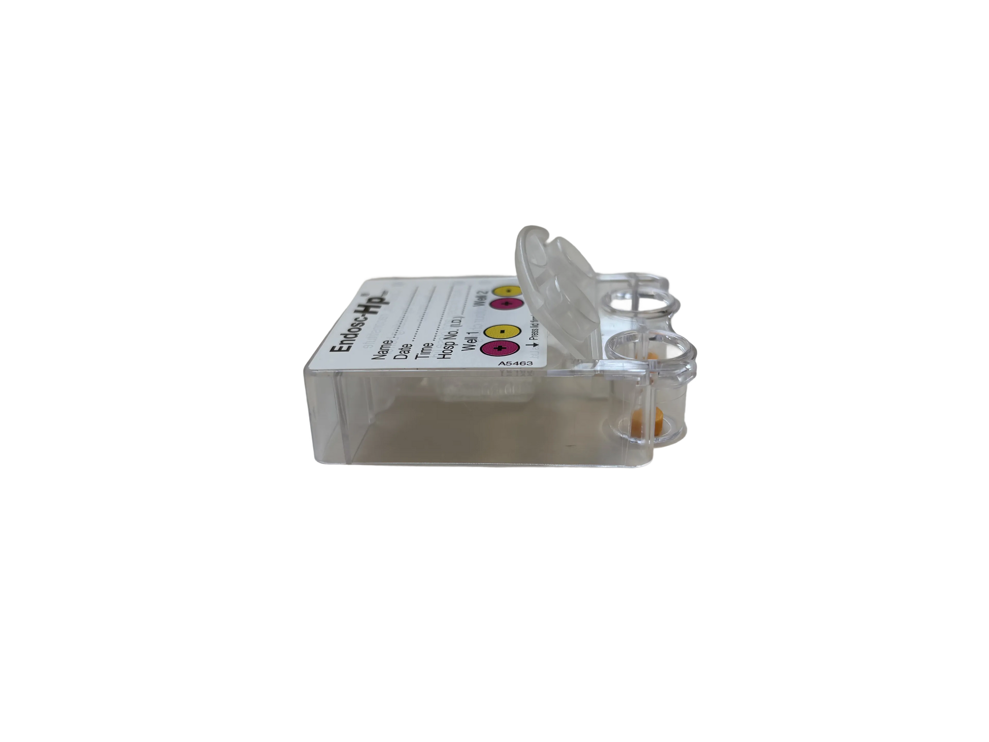 The Endosc-Hp® test kit consists of a twin well cartridge containing urea, phenol red and buffer salts in tablet form and an ampoule of buffer. If the urease enzyme ofHelicobacter pyloriis present in a biopsy specimen, the rise in pH associated with the hydrolysis of urea causes a change in colour from yellow through orange to magenta.